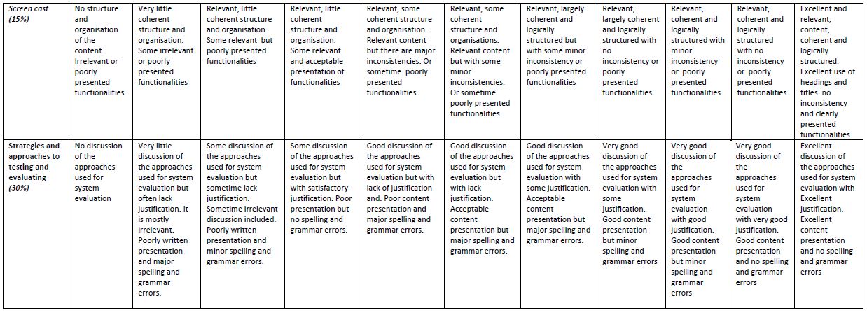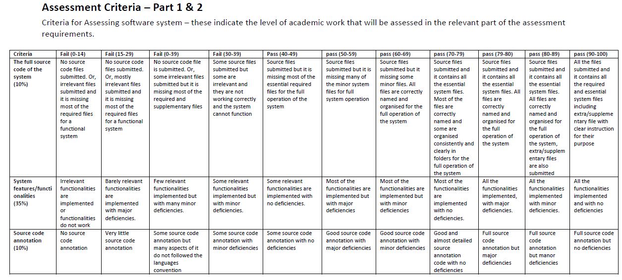 | Document Format | You are required to submit the following three files: 1. A zip file containing the full system source code file named “studentID_system_source_code.zip”. 2. A Microsoft word document named “studentID_reflective_report.docx” 3. A Screen cast--compatible with windows media player, or similar software-- named studentID_screencast. Replace “studentID” with your university student ID. Submit the file in the allocated assignment submission windows on Canvas. |