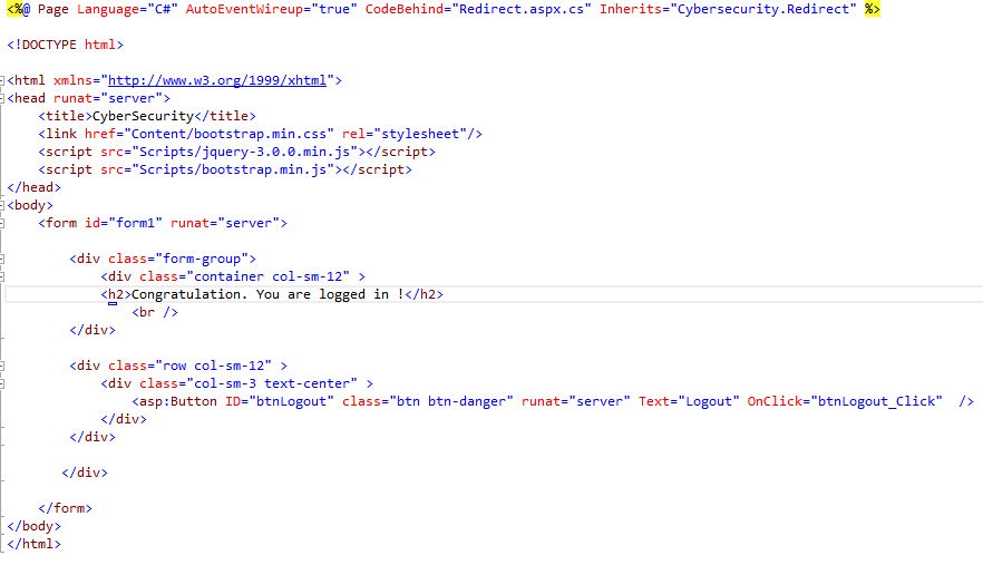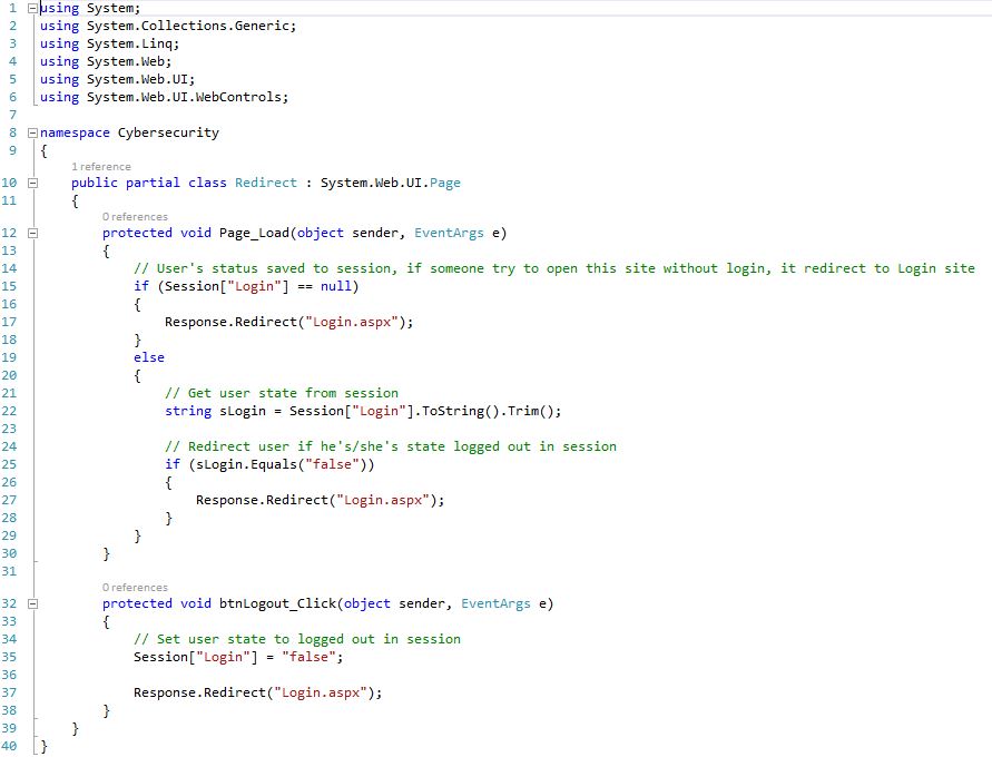 Redirect page (Redirect.aspx.cs) Shows: User's status saved to session, if someone try to open this site without login, it redirect to Login site. Get user state from session, Redirect user if he's/she's state logged out in session, Set user state to logged out in session.