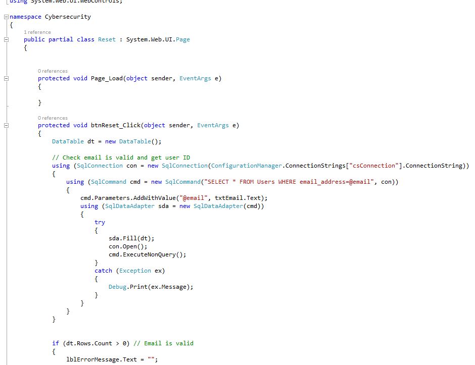 On the server side, to prevent SQL injection, passwords are stored in encrypted form in the database, which has the advantage of not being stolen, but care must be taken that the password required for encryption, which is required to encrypt and decrypt the password, is not accessible or lost. (Vandersteen, 2020) In an SQL query, the embedding of user inputs in an SQL statement is prevented by the AddWithValue method, so that it is not treated as a statement but placed at the end of the statement as a string variable. The advantage of this is that they thus confirm the code and cannot access the data (Durano, 2019).