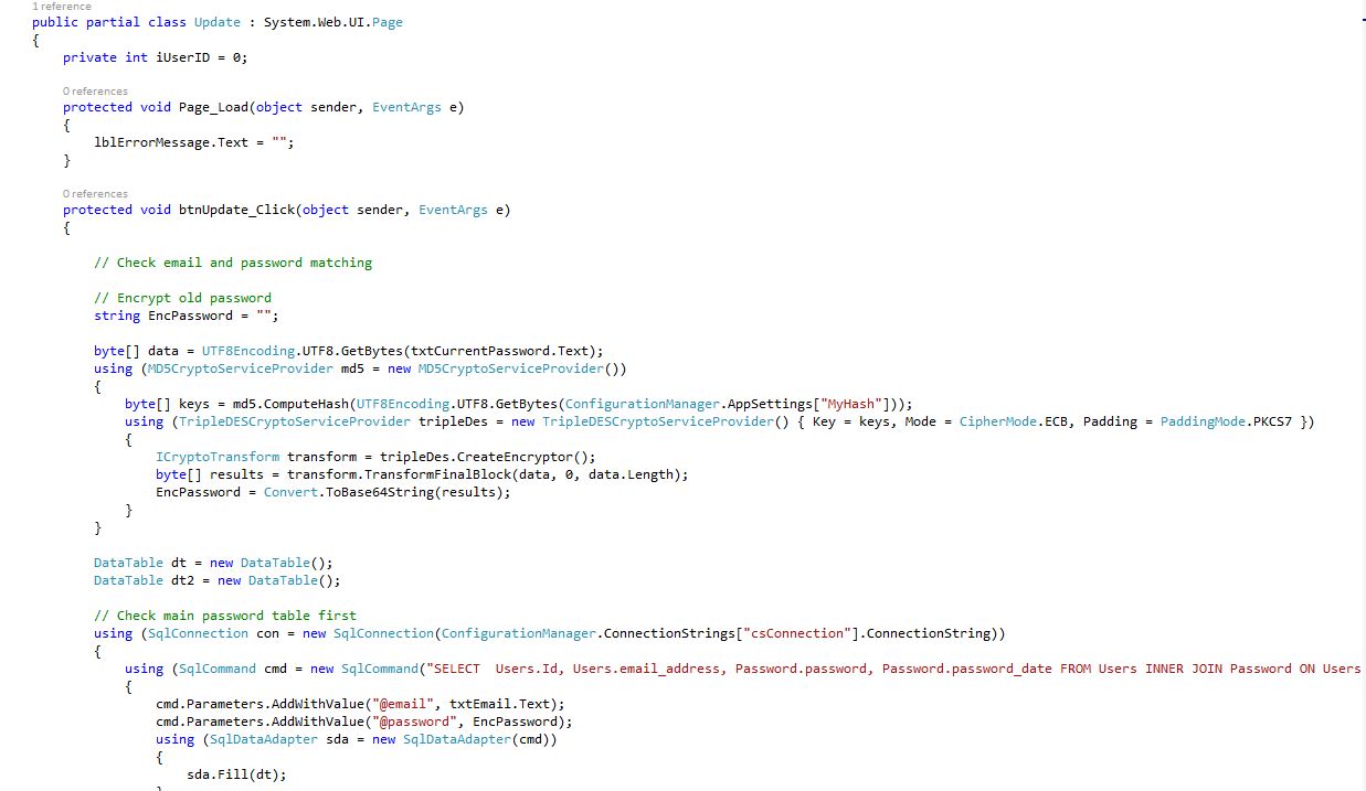 Password Update Form (Update.aspx.cs) Shows: Check email and password matching, Encrypt old password, Check main password table first