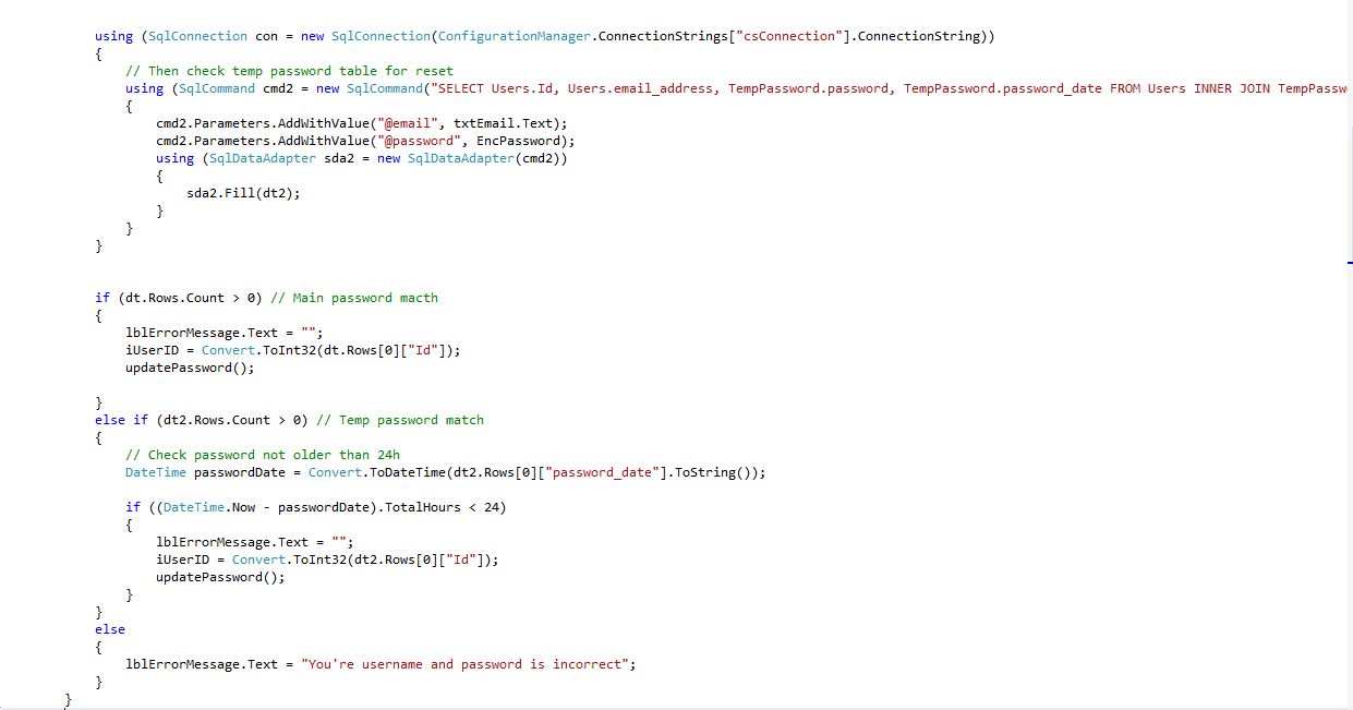 Password Update Form (Update.aspx.cs) Shows: Then check temp password table for reset, Main password match, Temp password match, Check password not older than 24h.