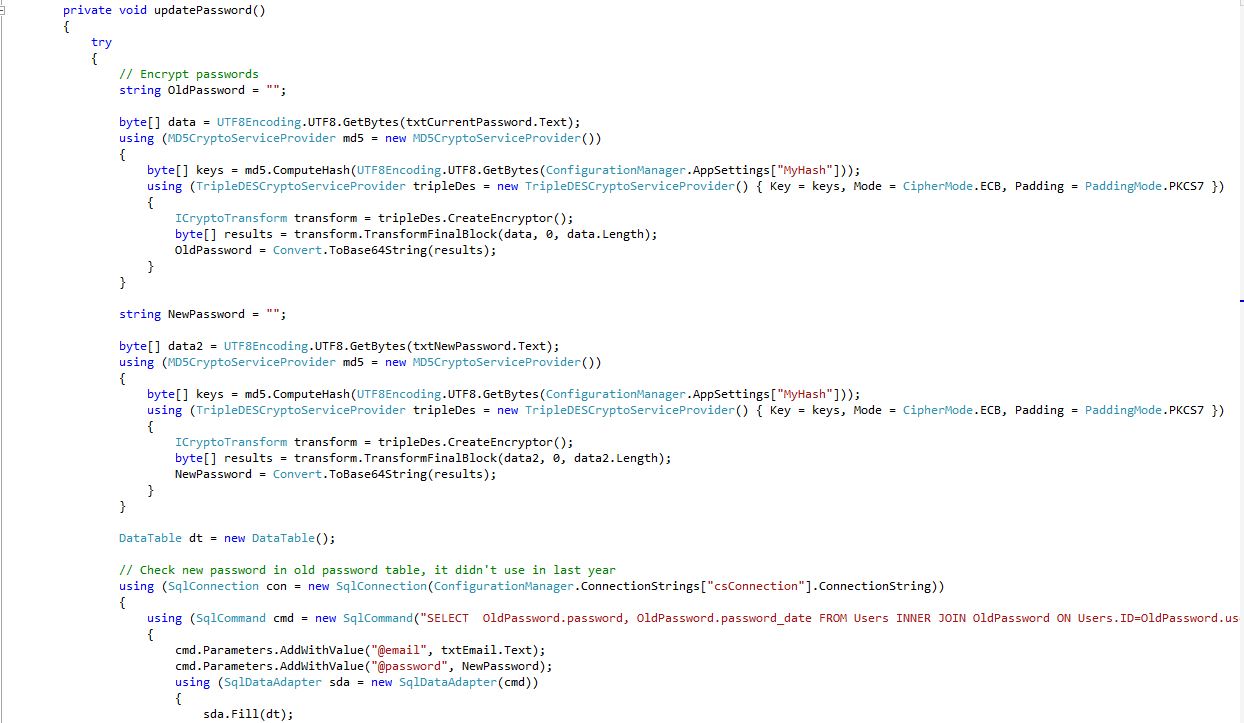 Password Update Form (Update.aspx.cs) Shows: Encrypt passwords, Check new password in old password table, it didn't use in last year.