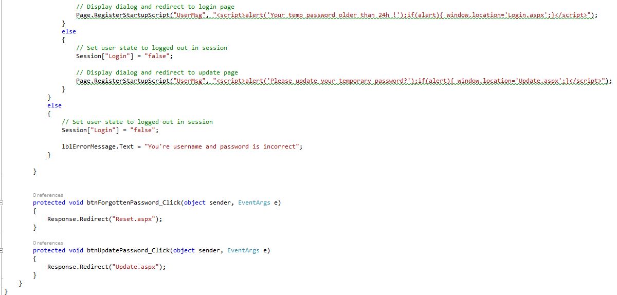 Login Form (Login.aspx.cs) Shows: Check main password table first, Then check temp password table for reset, Main password match, Check password not older than a month, Display dialog and redirect to update page, Set user state to logged in session, Temp password match, Check password not older than 24h, Set user state to logged out in session.
