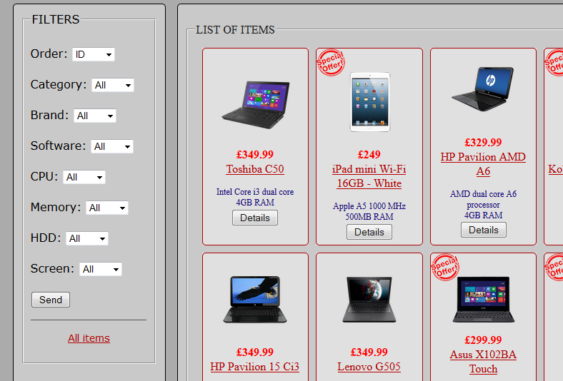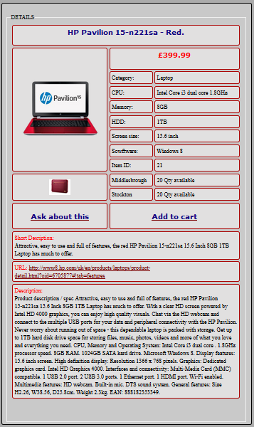 - item name - item price - item category - item brand - item model number - item availability - item special offer - item in stock - item operation system - item CPU - item memory - item HDD - item screen size - item short description - item description - item pictures - item official URL |