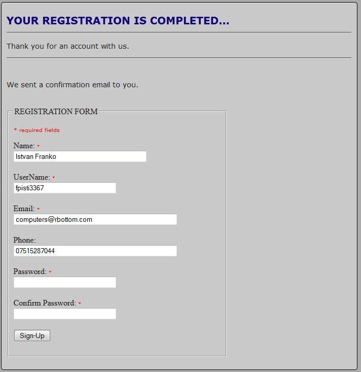 (1, 'Istvan Franko', 'bg47bp', This email address is being protected from spambots. You need JavaScript enabled to view it.', '07515287044', '********'),