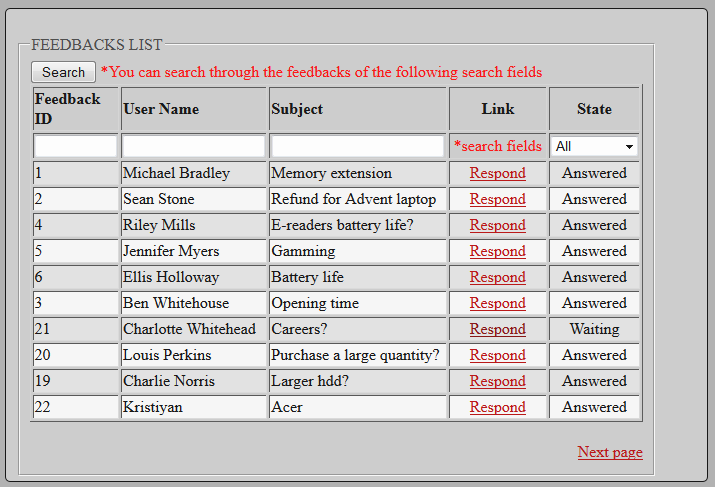 (2, '', 'Sean Stone', 'Refund for Advent laptop', 'I bought an Advent laptop from you two weeks ago.\r\nThe laptops do not meet the purpose you bought.\r\nWe can give it back to the place of purchase? ', ' This email address is being protected from spambots. You need JavaScript enabled to view it.', 'Answered', 'Sorry, that is not right purchase. To ours clients we offer 28-day refund or replacement at point of purchase.'),