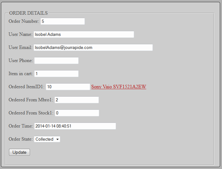 - order name - order email - order phone number - items in order - item id - ordered quantity - ordered from - order time - order state |