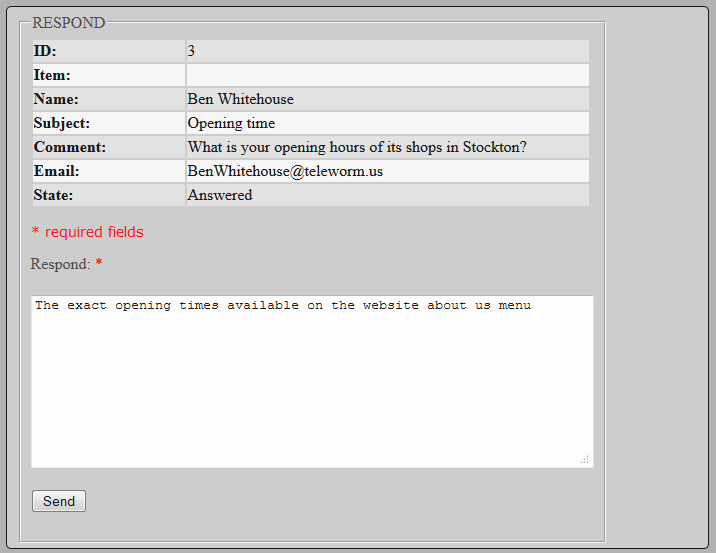 (3, '', 'Ben Whitehouse', 'Opening time', 'What is your opening hours of its shops in Stockton? ', This email address is being protected from spambots. You need JavaScript enabled to view it.', 'Answered', 'The exact opening times available on the website about us menu'),