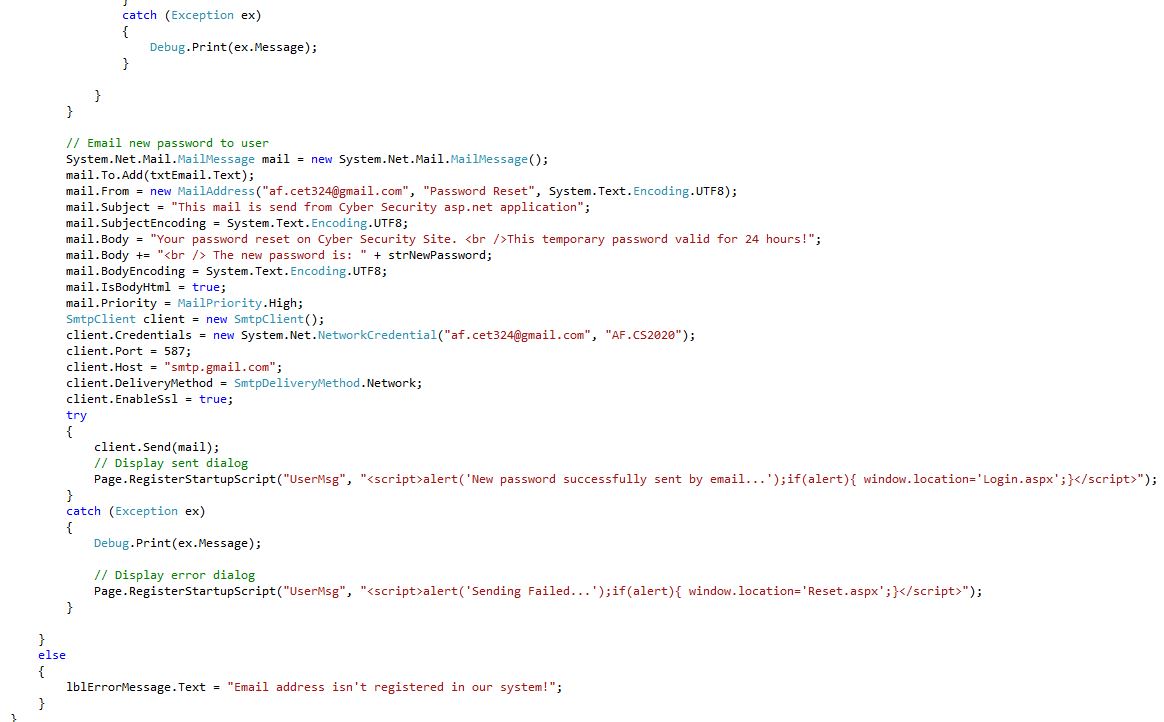 Reset Form (Reset.aspx.cs) Shows: Check email is valid and get user ID, Email is valid, Generate a new password end encrypt, Email is valid get Id, Save new password to database, Delete user's previous password and insert new one to temp password table, Email new password to user, Display sent dialog, Display error dialog.