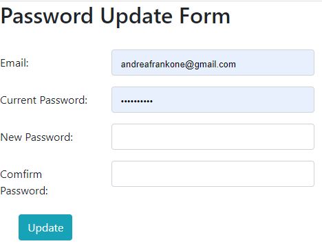 On the Password Update form page, you can update your password by entering your email and Current, New, Confirm password. Once this is done, you can log in with the updated password on the Login page.