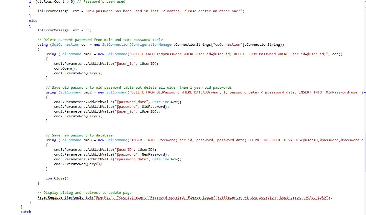 Password Update Form (Update.aspx.cs) Shows: Password's been used, Delete current password from main and temp password table, Save old password to old password table but delete all older than 1 year old passwords, Save new password to database, Display dialog and redirect to update page.