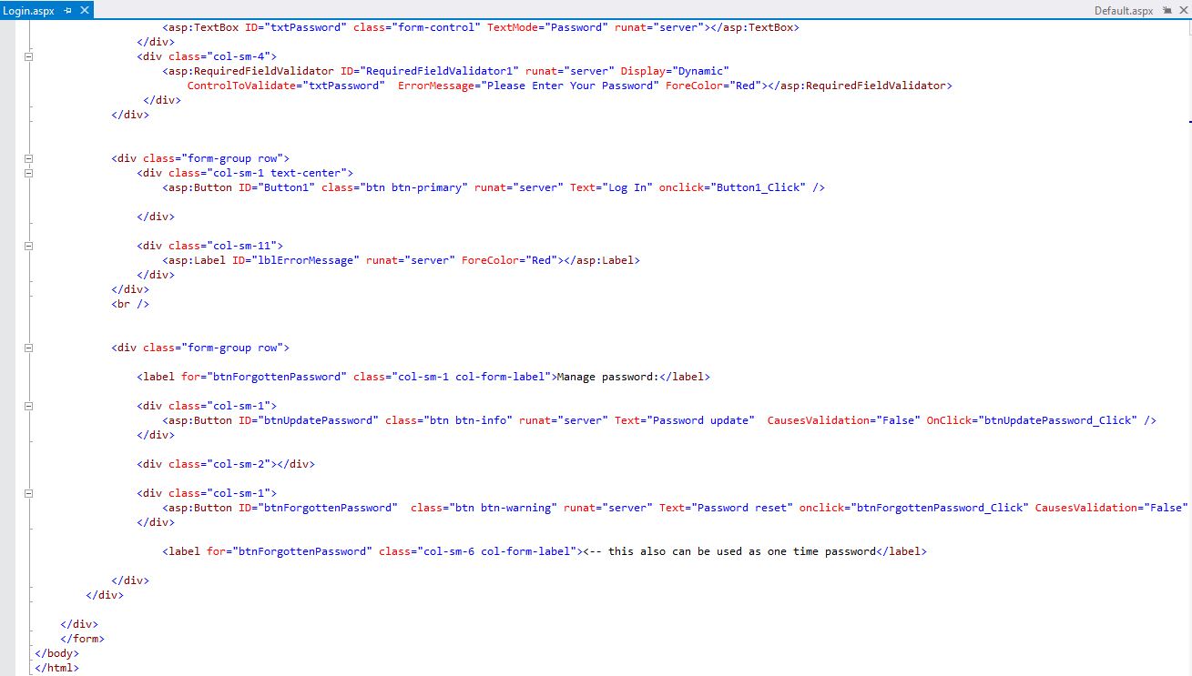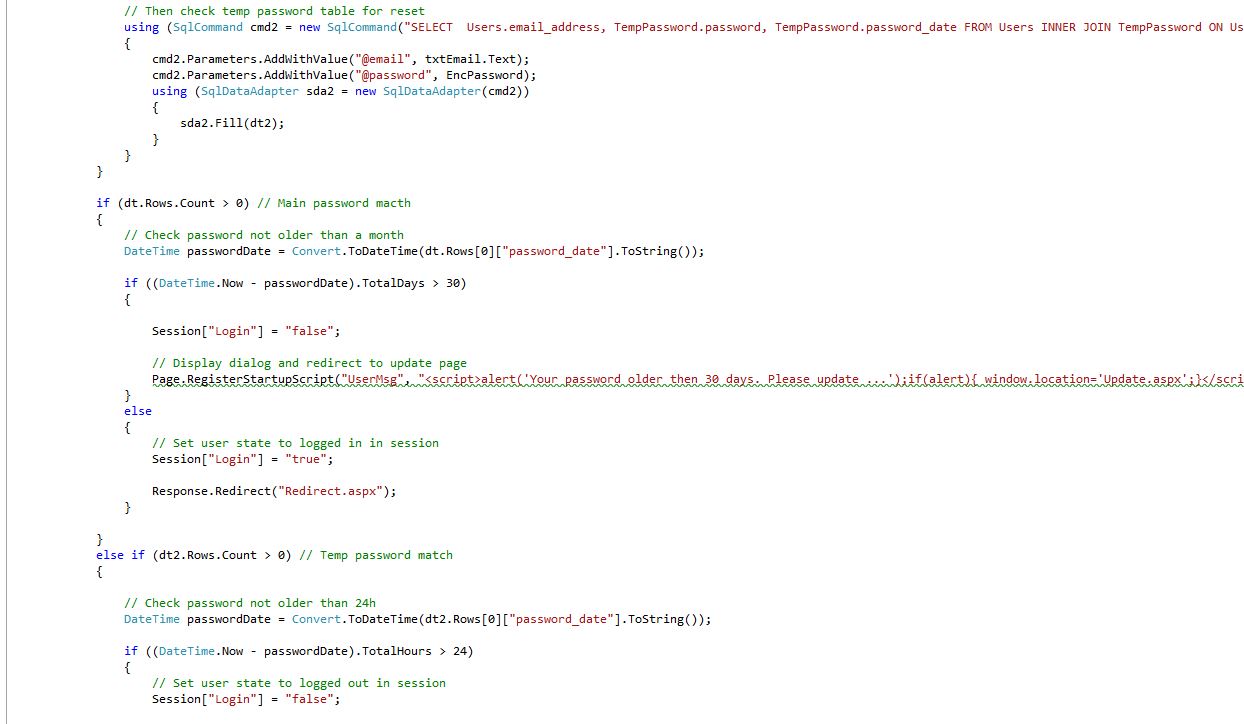 Login Form (Login.aspx.cs) Shows: Check main password table first, Then check temp password table for reset, Main password match, Check password not older than a month, Display dialog and redirect to update page, Set user state to logged in session, Temp password match, Check password not older than 24h, Set user state to logged out in session.