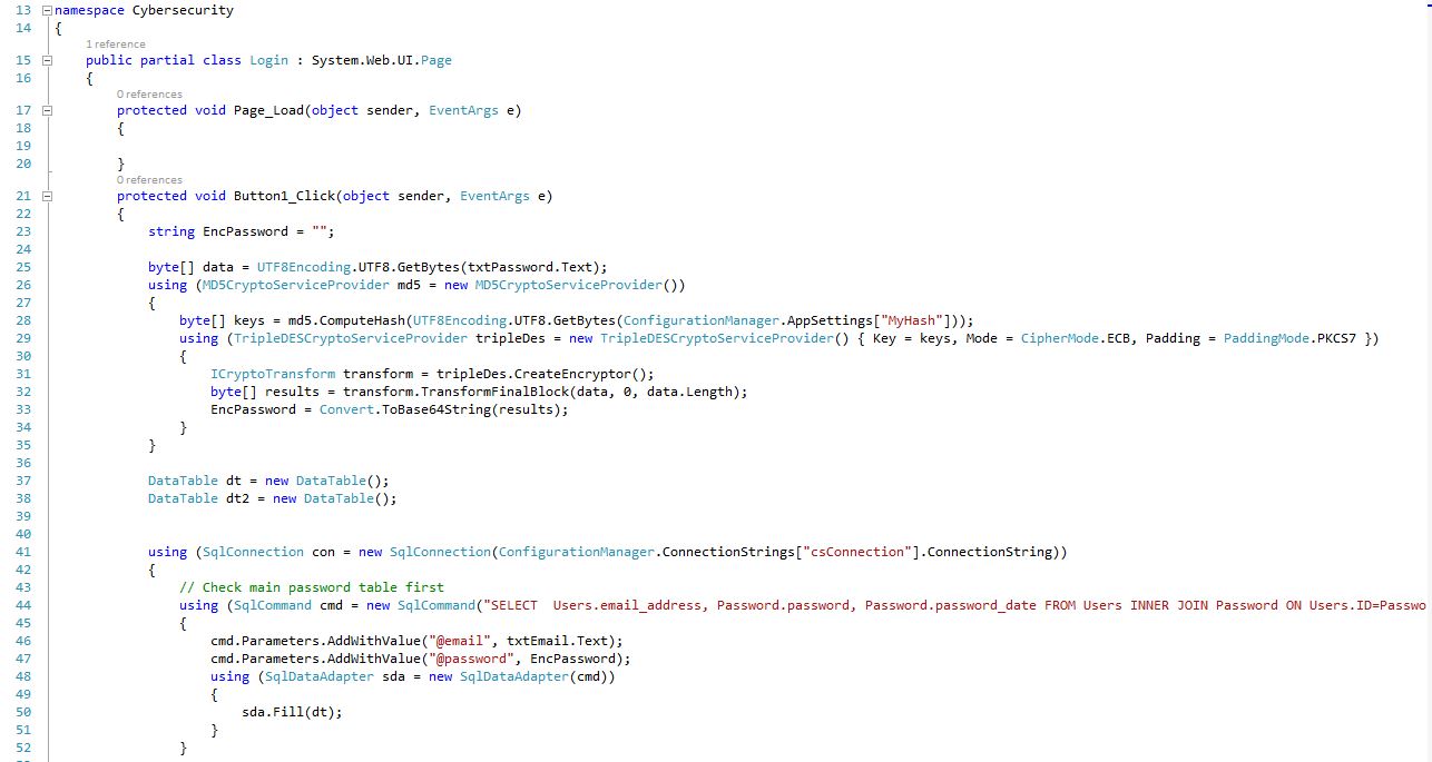 Login Form (Login.aspx.cs) Shows the code encryption, Check main password table first.
